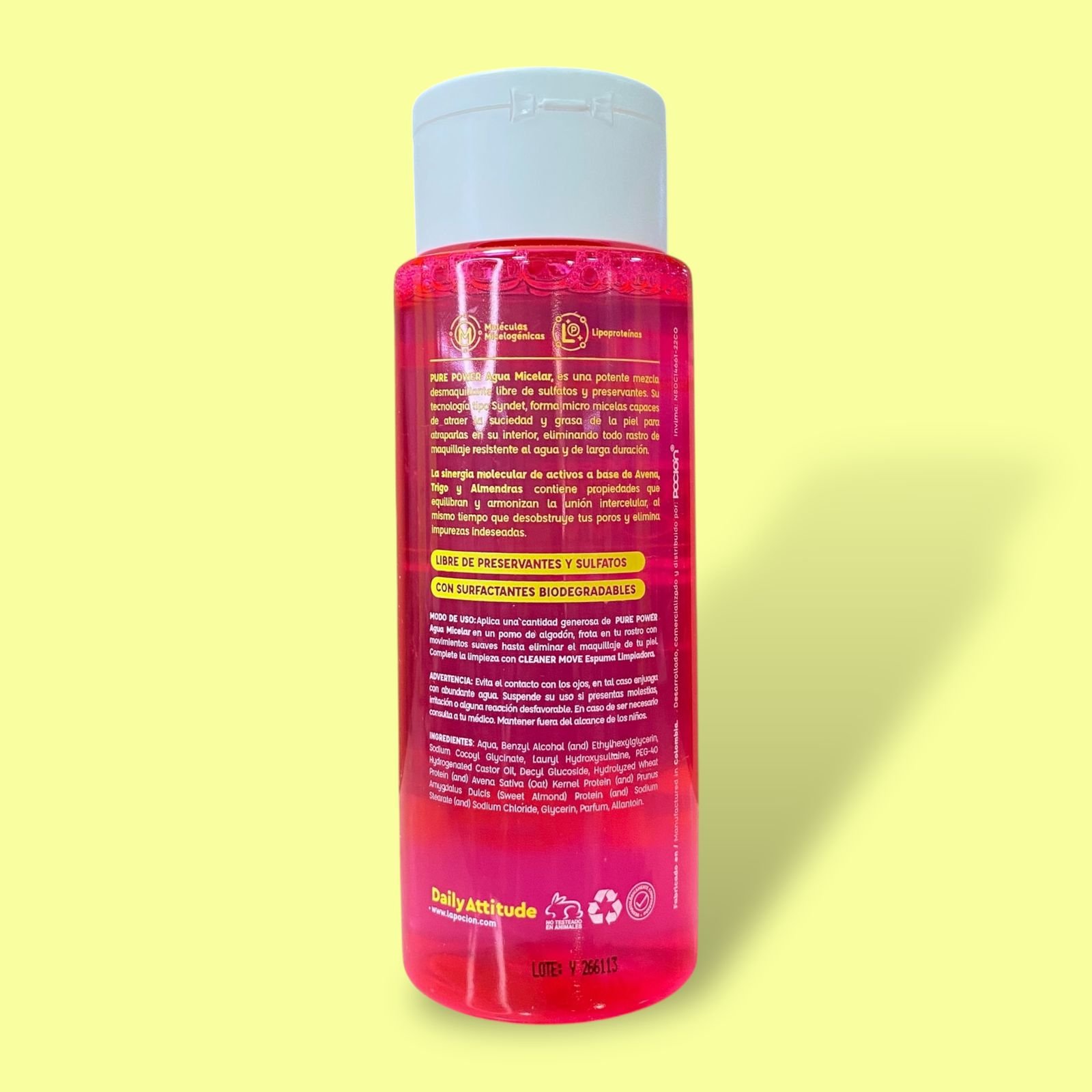 Pure Power Agua Micelar, es una potente mezcla desmaquillante libre de sulfatos y preservantes. Su tecnología tipo syndet, forma micro micelas capaces de atraer la suciedad y grasa de la piel para atraparlas en su interior, eliminando todo rastro de maquillaje hasta el resistente al agua y de larga duración.