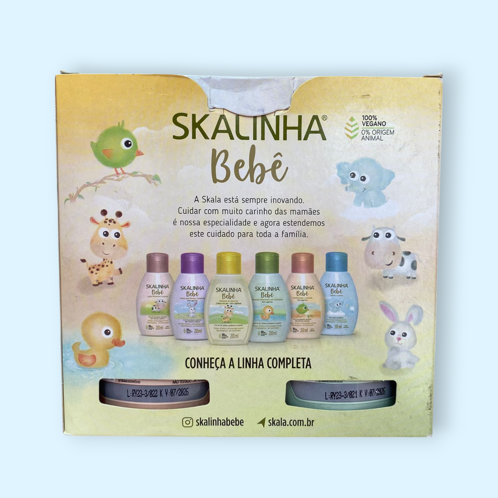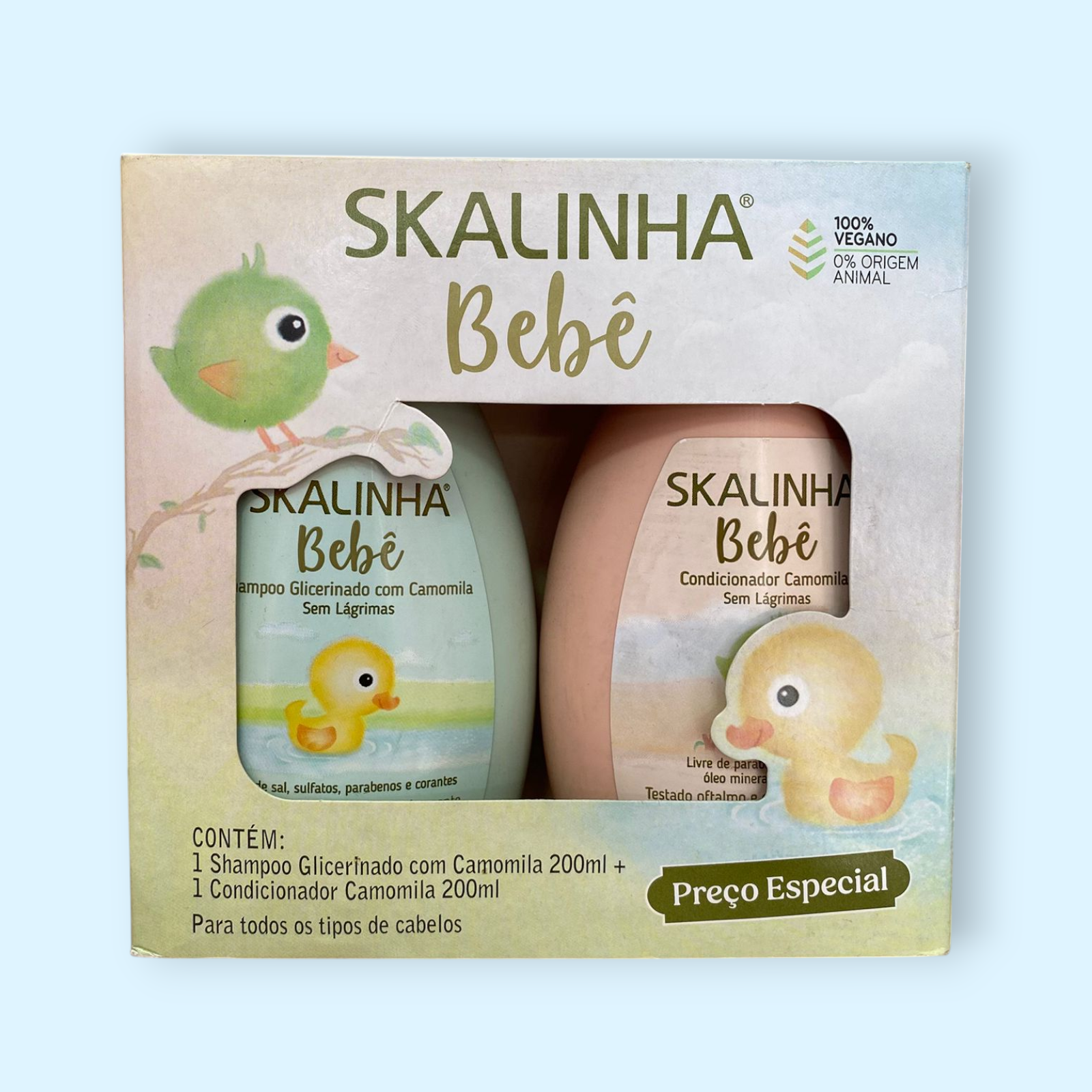 El Kit Skalinha Bebê ha sido desarrollado especialmente para niños de 0 a 5 años, con ingredientes suaves, fórmulas hipoalergénicas y pH balanceado que cuidan la piel y el cuero cabelludo sensibles.  Incluye productos como shampoo, acondicionador, jabón líquido, loción hidratante y colonia, todos libres de sulfatos agresivos, parabenos, colorantes innecesarios y con certificación vegana.